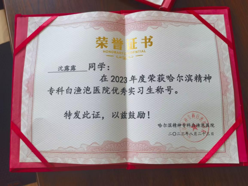 企业指导教师张丽丹表示健管专业的学生认真坚守岗位,严格遵守实习纪律,服从实习单位管理在岗位上虚心学习,遇到不懂之处,向带教老师请教。我校学生在白渔泡精神专科医院的工作能力有目共睹,受到了带教老师的肯定,尤其是沈露露同学在实习期间表现突出,荣获优秀实习生的称号。