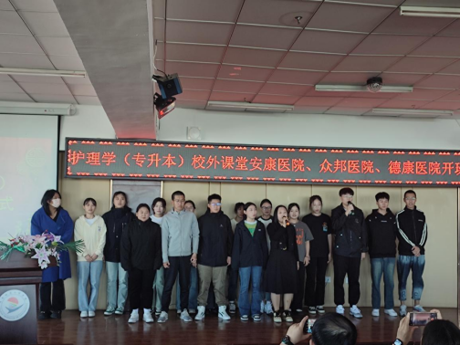 三个校外课堂班级的学生分别前往安康医院、众邦医院和德康医院实习,开班仪式上学生们斗志昂扬的喊出出征口号。