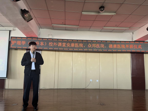 单大海在开班仪式上发言,对即将出征的同学们提出两点要求:一是严格要求自身,遵守医院制度,服从医院安排。二是珍惜学习机会,努力掌握实践本领,为就业奠定基础。