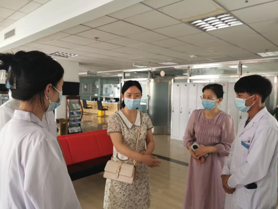 第二站来到齐齐哈尔附属第三医院,在护理学223班孙学松同学引导下参观了血液科和肿瘤二,在参观过程中,郭主任询问学生在医院实习与在学校的异同点、专业实践学期手册撰写情况、排班情况、所在科室情况及医院食堂的餐食等。叮嘱学生注意职业暴露、饮食安全、防暑防暴等。