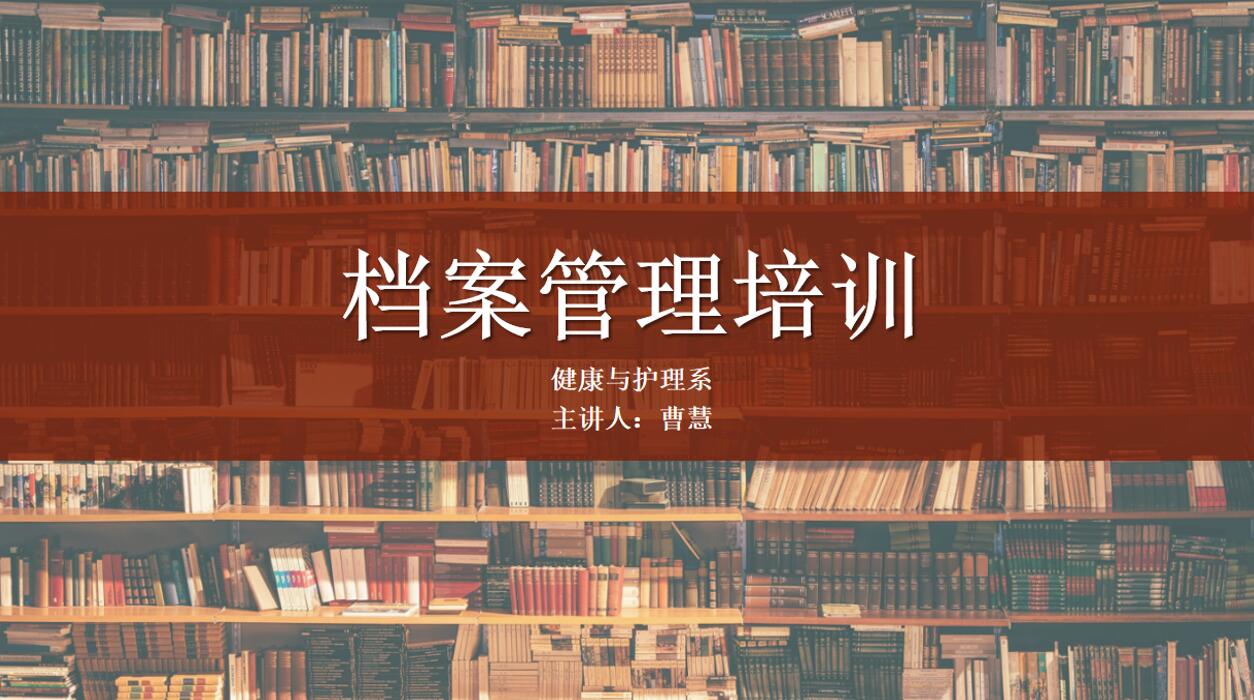 2023年4月11日,健康与护理系于1教1213开展档案管理培训,系兼职档案员曹慧老师主持,全体教职工参会。