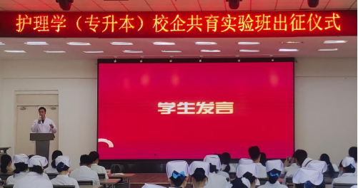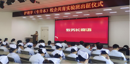 仪式上,教务长张静肯定了护理学(专升本)校企共育实验班筹备工作所做出的努力,以职业教育的3个“融合”,即职普融通、产教融合、科教融汇为契机指出,本次实践也是顺应现代职业教育体系建设改革的重大举措,并以一位13岁初一学生的作文《勇气》勉励护理学(专升本)专业首批校企共育实验班同学有勇气跨出人生“感想而不敢做”的选择。最后提出3点殷切期望:(一)提高部门领导和老师们的思想认识,将以此为基础,做好横向课题开发、教师挂职锻炼等各项工作;(二)教师自身应进一步明确目标,在做好校企共育工作基础上,及时发现问题,查找不足,挖掘典型案例,持续改进;(三)同学们应强化自身双重身份,并以“四会”为标准,即学会做人、学会共处、学会学习、学会创造,严格遵循学校和医院管理制度,做好由学生“向职业人”的转变,在校企双导师的带领下,同学们通过职业化的学习和塑造,树立健康的职业观与职业道德意识,养成良好的职业素养;通过深度融入企业生产实践,掌握过硬的职业技能本领,提升核心竞争力,为以后就业拓宽渠道。