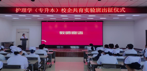 4月9日上午,健康与护理系护理学(专升本)专业校企共育实验班出征仪式在2教2508学术报告厅举行,齐齐哈尔工程学院教务长张静、健康与护理系负责人郭玲玲、健康与护理系教学工作副主任张林琳、健康与护理系学生工作负责人姜宏伟、护理学(专升本)专业负责人单大海、护理学(专升本)2022级学生辅导员米新及专业教师出席出征仪式。出征仪式由专业负责人单大海主持。