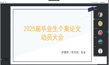 为保证2025届学生毕业论文(个案报告)指导工作高质量开展,2024年11月7日下午,护理学(专升本)专业通过线上形式召开2025届毕业论文(个案报告)指导动员大会,本次会议由专业助理杨兰主持,全体指导教师参会。