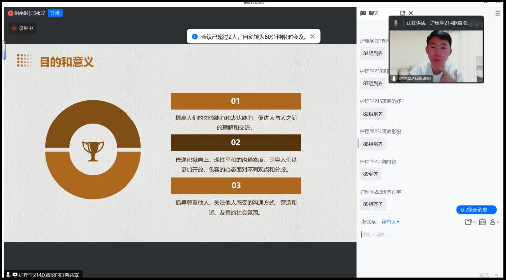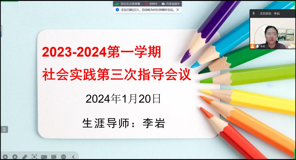2024年1月20日晚上8点,在腾讯会议开办了【社会实践学期】第三次指导会议,本次会议由李岩老师主持,参加会议的人员有社会实践学期队长孙学松、组长韩昕妤、王子依、彭千玉、齐正宇、翟超越、高彤悦、魏可钦以及各组成员。同学们在规定时间内参加会议,非常准时。