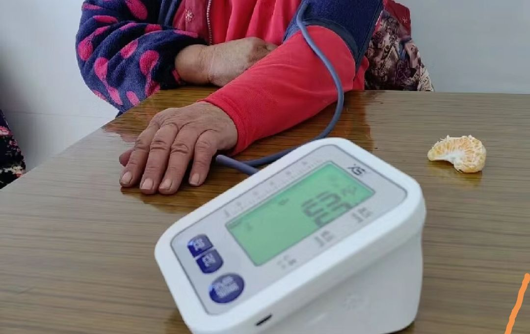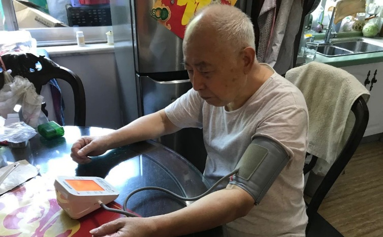张然同学跟随社区人员来到一些老人家中为他们量血压。一些家中儿女外出打工的老人,很容易忽略自己的健康问题,社区会定期去探望,简单地测量血压、血糖。