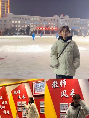 小组成员沈美溪在2024年1月15日回访了母校哈尔滨剑桥三中,再次看到久违的环境,她感到十分怀念,怀念高中的生活,人和事。再次看到班主任她还是站在讲台上讲着朗朗上口的英语。她和老师说了很多话,她也告诉同学们,在接下来的高考不必特别紧张,放松的应对,要对自己有信心,坚信自己,努力考上自己心仪的大学。