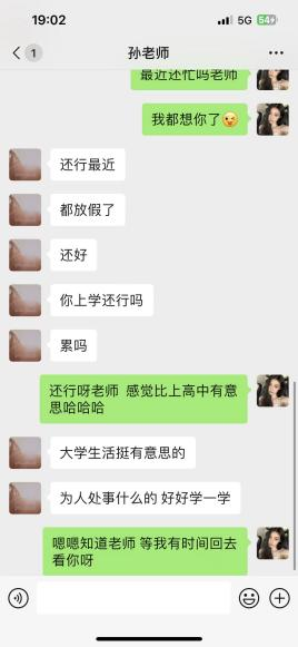 小组成员李佳慧在2024年1月3日跟老师进行了线上的沟通,她的母校是镇赉县第三中学校。她给老师看了现在大学的学校,分享了大学生活的多姿多彩,说了很多有趣的事情。老师也对她说了一些她在大学时光的脚步,老师叮嘱她在大学里也不要总想着玩,提升自己才是最重要的。