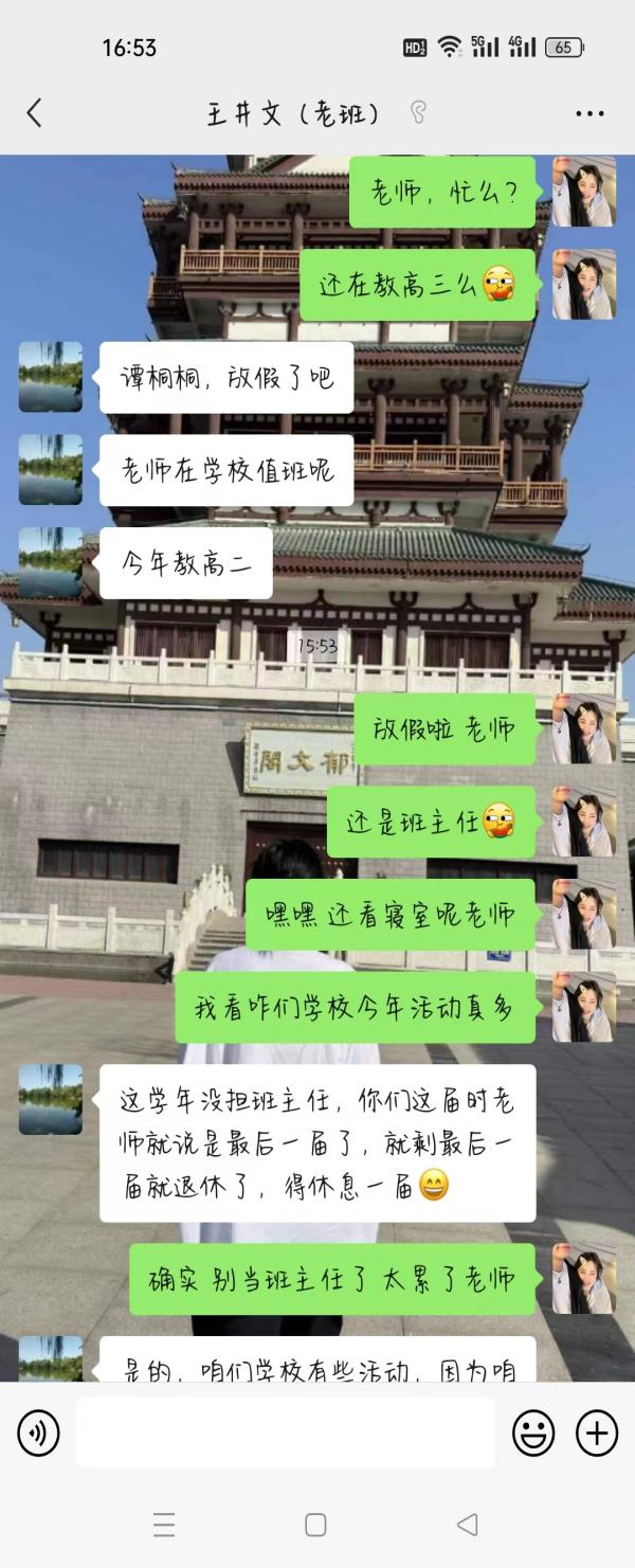 谭桐桐同学联系了她的高中班主任进行了线上回访,高中班主任对她很关心,给她讲了一些以后目标、以后想干什么以及是否有考研的方向,告诉她不要一直想着高考成绩,高考成绩并不决定一切,这个成绩只代表高中并不代表未来。在大学里要认真努力踏实的去学习。而且也了解了她的专业,并且说护理这个专业很好就业,但也很辛苦,功夫不负有心人,无论怎么样自己也没有白付出,并告诉她做什么事情都要有提前的准备,做万分的准备才有成功的机会。
