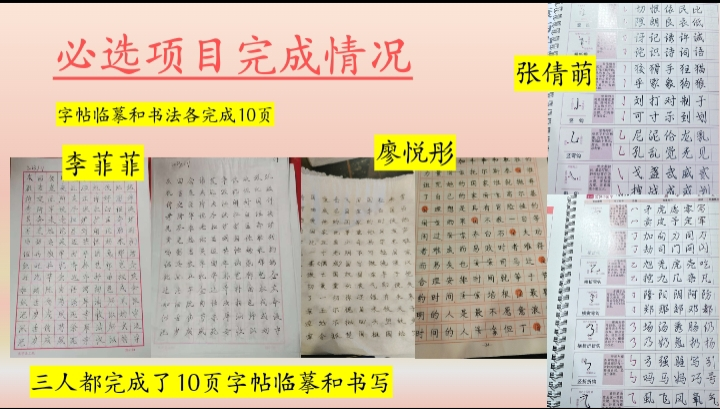 通过前两周的学习,HLX-244组的小组成员李菲菲、张倩萌、廖悦彤分别完成了:字帖临摹和书写各10页、读书交流一次、居家劳动一次;李菲菲、廖悦彤2人学习强国积分累积290分以上;张倩萌音乐美术鉴赏完成近半。