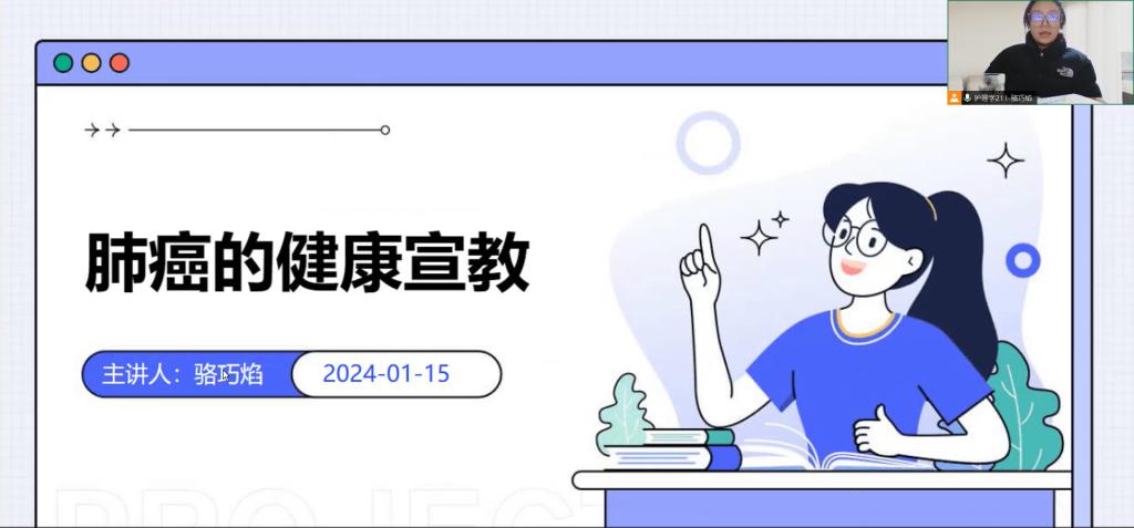 为了提高公众对肺癌的认识,并促使人们重视肺癌的预防和早期筛查。2024年1月15日于线上组织开展肺癌健康宣教活动。本次宣讲活动由骆巧焰主持,社区成员参加。