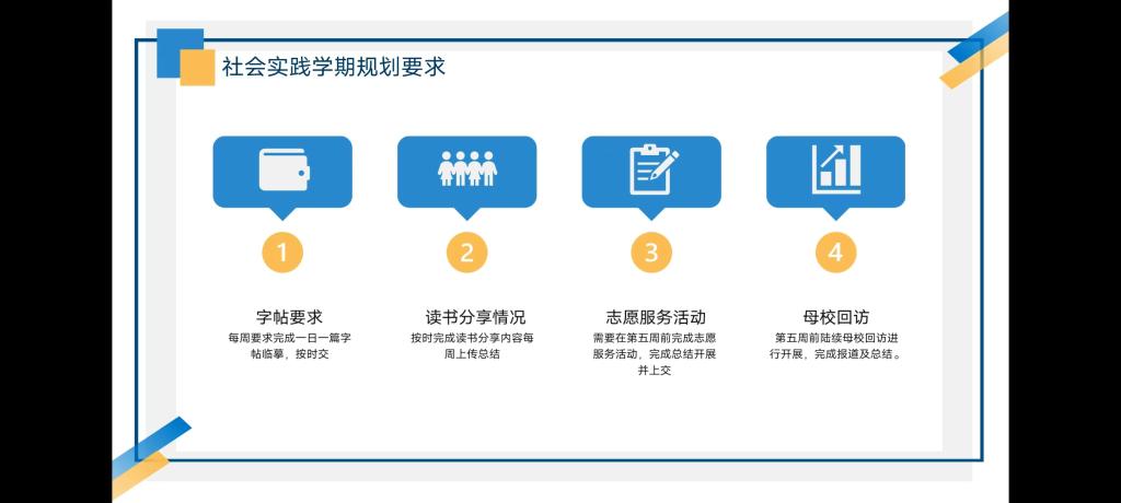 为了让我们更好的融入社会服务社会,实行了社会实践学期,组内制定了社会实践学期规划,明确了社会实践学期要求与目标。首先,我们交流了本周社会实践学期的学习成果:感恩父母,居家劳动,音乐鉴赏,坚持每天写一页字帖和读书交流(一生,悲惨世界等)。其次,我们沟通了关于志愿服务活动和母校回访方面的内容,我们一致认为应该尽早落实这两项任务。最后,我们共同制定了接下来的学习计划。星期一至星期五每天一页字帖,在第二周至第四周完成读书交流,本周进行读书交流《悲惨世界》,并决定在第五周之前完成母校回访和志愿服务。