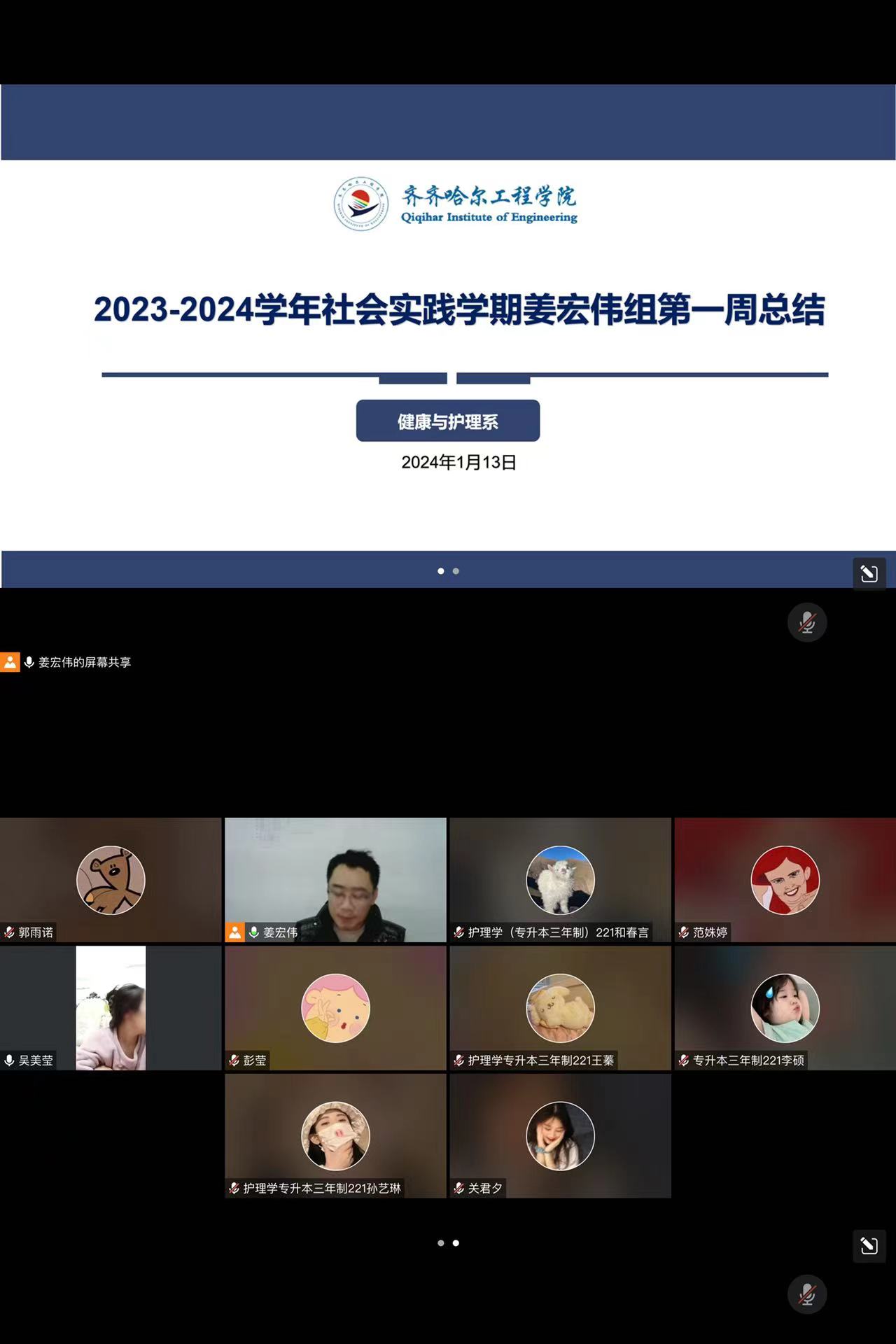 2024年1月13日,健康与护理系姜宏伟老师通过线上腾讯会议,带领同学们进行第一周总结。会议由姜宏伟老师主持,护理学(专升本三年制)221班9名同学参加。