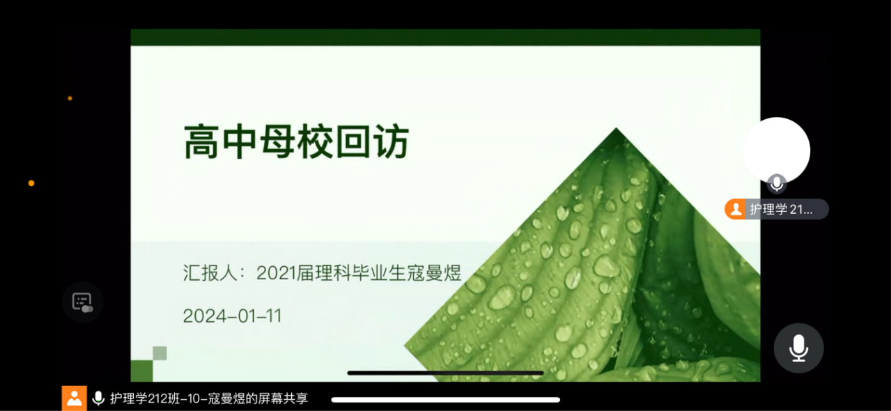 寇曼煜同学通过在与老师的聊天中了解到现在同学的学习情况以及老师在教学上的改动,同时也以一位理科毕业生的身份为母校的学弟学妹提供了一些如何选择大学专业的建议。并在本次母校回访中与同学们分享自己的学习经验,以及自己选择的大学专业是怎样的,有何特点。
