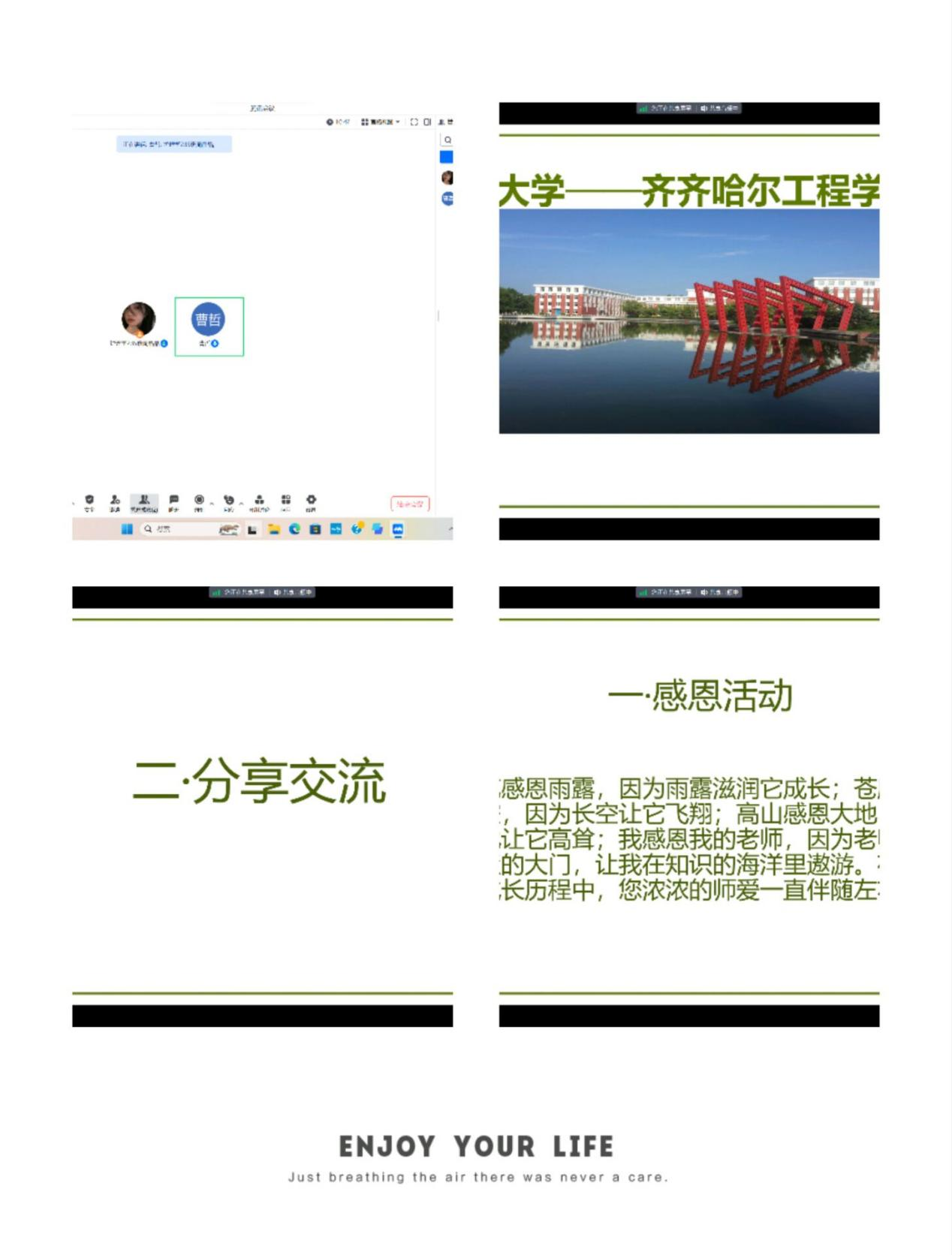 其次,进行了分享交流。大学不仅是知识的殿堂,更是我们成长的重要阶段。在这里,我们学会了独立思考、自主学习,更在无数的尝试与挑战中成长为更好的自己。