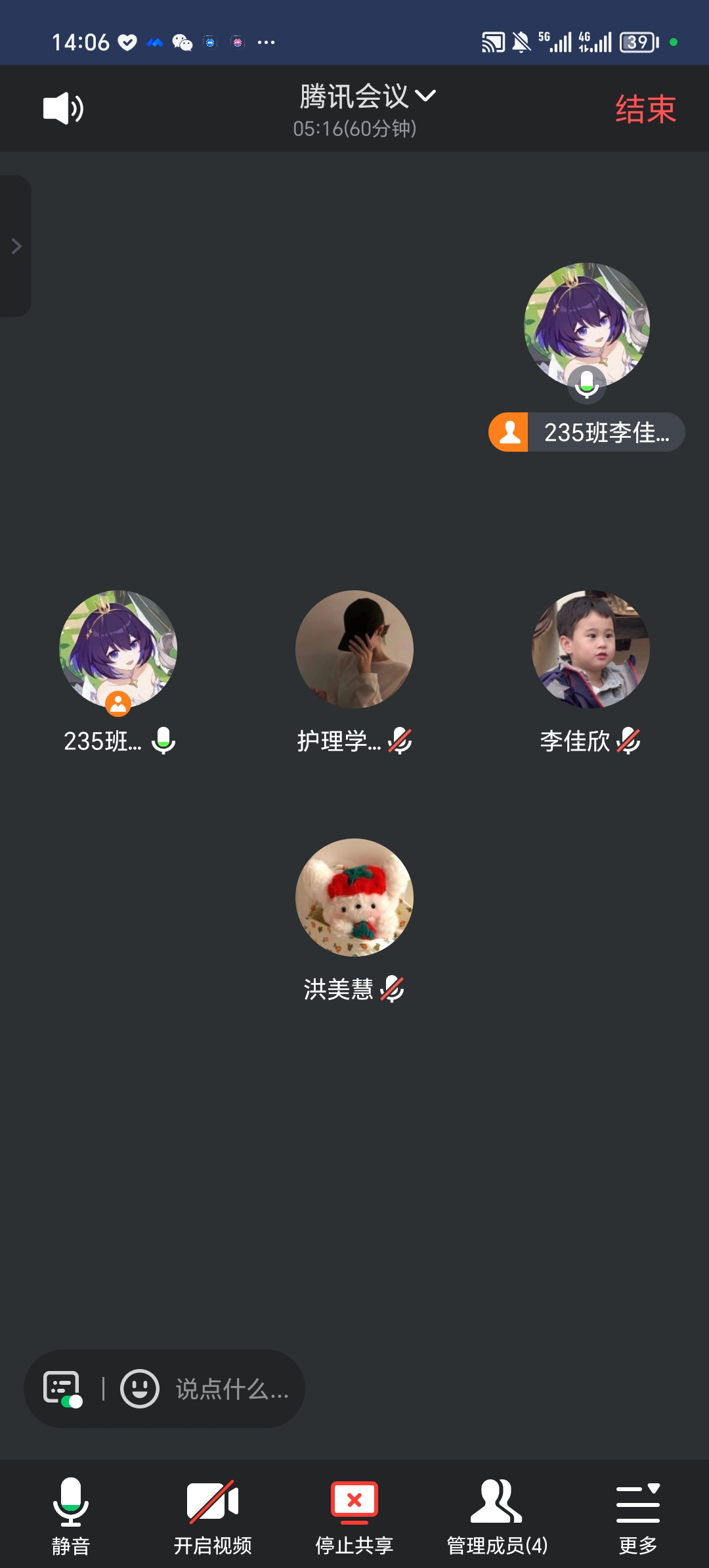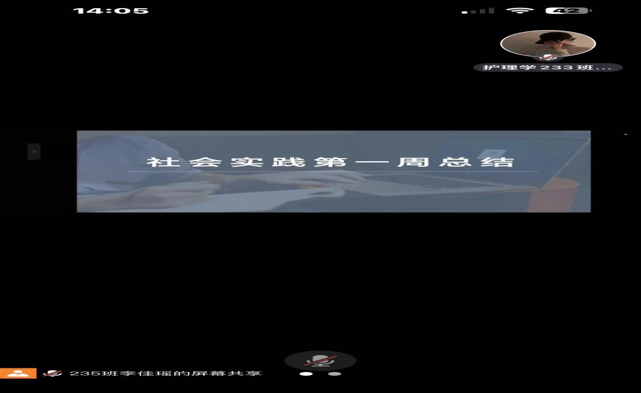 社会实践已经过去一周了,为总结本周实践的结果与不足,于2023年1月13日上午,由护理学235班李佳瑶主持,护理学235班洪美慧、李佳欣,护理学233班冯美妍同学参与开展了本次社会实践线上总结会议。