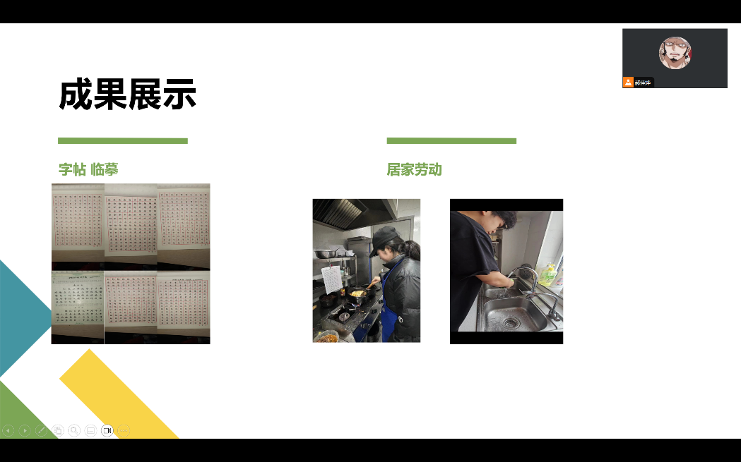 通过这一周的学习,我们组共完成字帖临摹24页,成员们分享了自己的读书心得,并且出色地完成了居家劳动等任务。在老师的指导下大家都在认真地完成自己的任务,与组员们交流心得时发现,大家对字帖临摹都很喜欢,同学们一致认为字帖临摹可以提升书写的能力,在书写的过程中也可以陶冶情操。