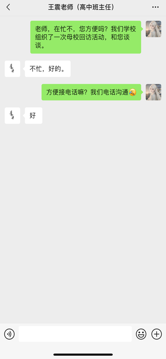 虽然我没有到达校园内,但我怀揣着对母校的感激与班主任沟通,并且用我朴实的经验给母校带来帮助。通过班主任我与部分高中学生进行沟通,我才身临其境地深刻体会到,或许我们的所谓经历,所谓经验,对他们其实并无多大影响,因为路最终还是靠自己走出来的。而我们扮演的这个角色,实际上能做的只有带给他们希望,不停地鼓励他们,给他们更强大的自信,让他们在所剩不多的日子里记着有那么多学长学姐在前方等候,在大学中等候。让他们鼓起勇气走到最后一刻。
