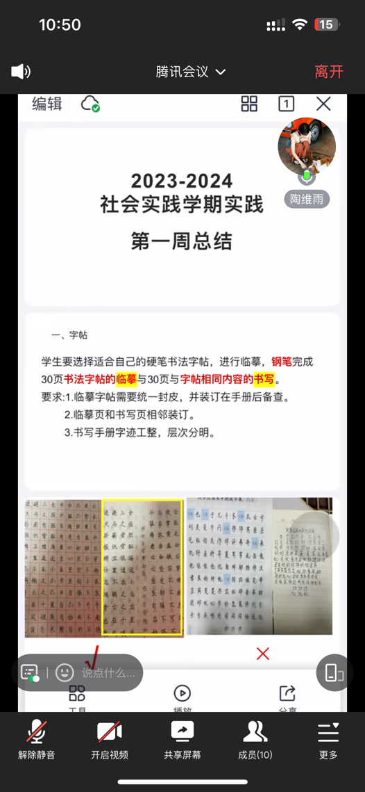 其次,毛老师首先针对居家劳动的水印照片,提出了打卡时要注意水印的准确地址和时间,在拍水印照片时要把本人露出来。以及居家健康运动部分,强调上交的是打卡视频每周1次,录制居家锻炼视频,动作标准,时问3-5分钟,每周末上传至QQ相册。