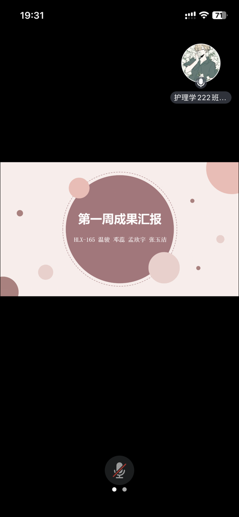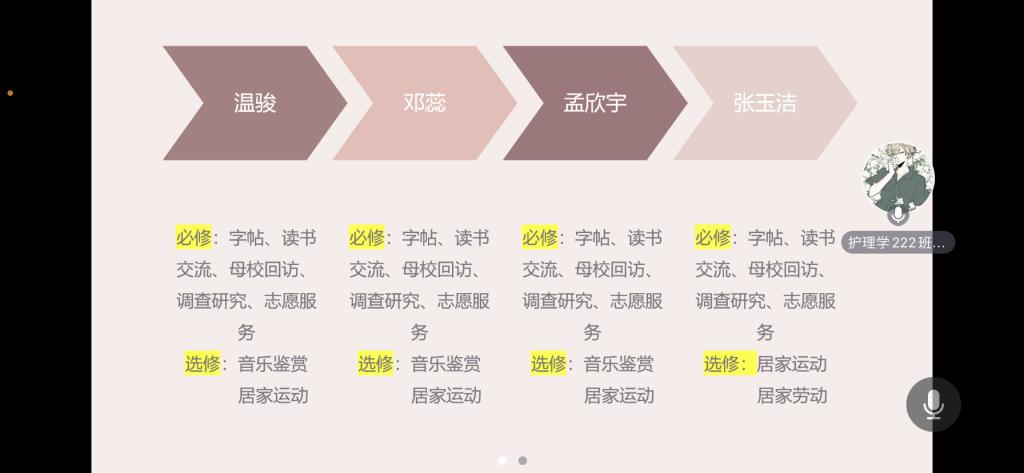 首先,闫梦思老师亲切地向到会人员致辞欢迎,并向全体人员介绍本次召开会议的目的,以及总结汇报方式。而后由孟欣宇同学代表本组进行ppt形式的总结汇报,其中展示了成员的任务分配,本组本周的完成进度以及各个成员的活动完成情况。