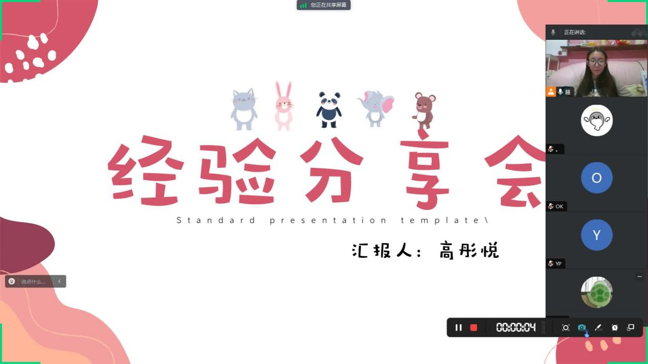 接下来的第二部分则是向学弟学妹们分享经验,但由于校园放假原因只能进行线上交流,由徐菲老师帮忙召集学弟学妹参加线上会议,在此期间我向学弟学妹们由衷地表达了对母校及老师们的热爱和分享了近期的大学生活,向大家介绍了学校的文化内涵,为学弟学妹们解答了对以后方向的一些迷茫,通过交流会使得学弟学妹们不仅明确了以后的目标,更使我坚定了对学校的热爱。