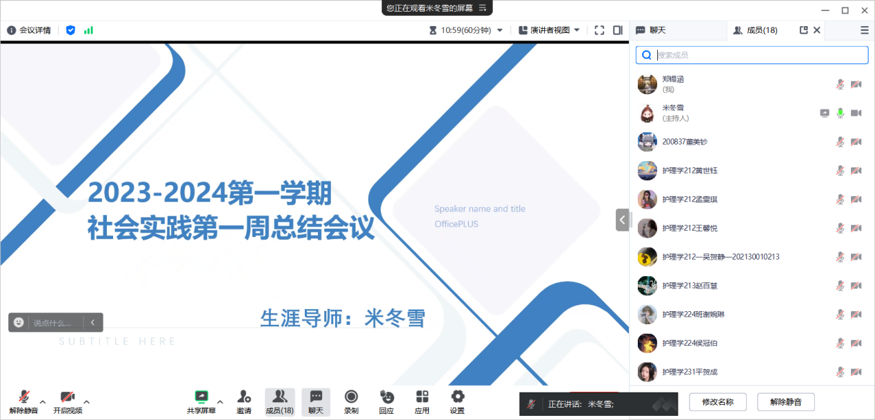 在2023年-2024年社会实践学期中,米冬雪老师带领学生们积极投入实践,并成功召开了第一次总结会议。此次会议不仅对本周完成作业的情况和作业质量进行了全面总结,还为学生们布置了下周的作业内容。