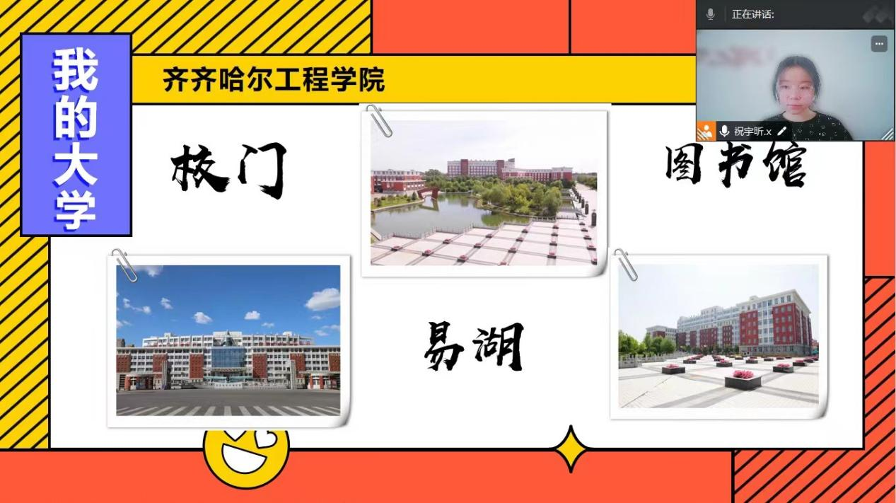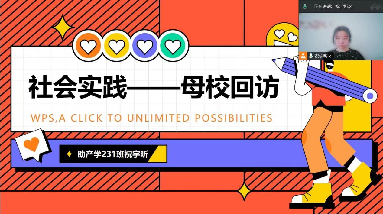 首先,祝宇昕简单的做了一个自我介绍,说明回访情况以便于进行活动的开展。其次开始讲述自己在母校的时光,感谢母校曾经的培育和老师的教导和关心。然后分享我的学习经验和学习方法,分享我高中到大学的学习历程。接下来开始介绍我的大学,分享校园美景、校园文化和校园风采。以及学校的教育方针与教育制度。