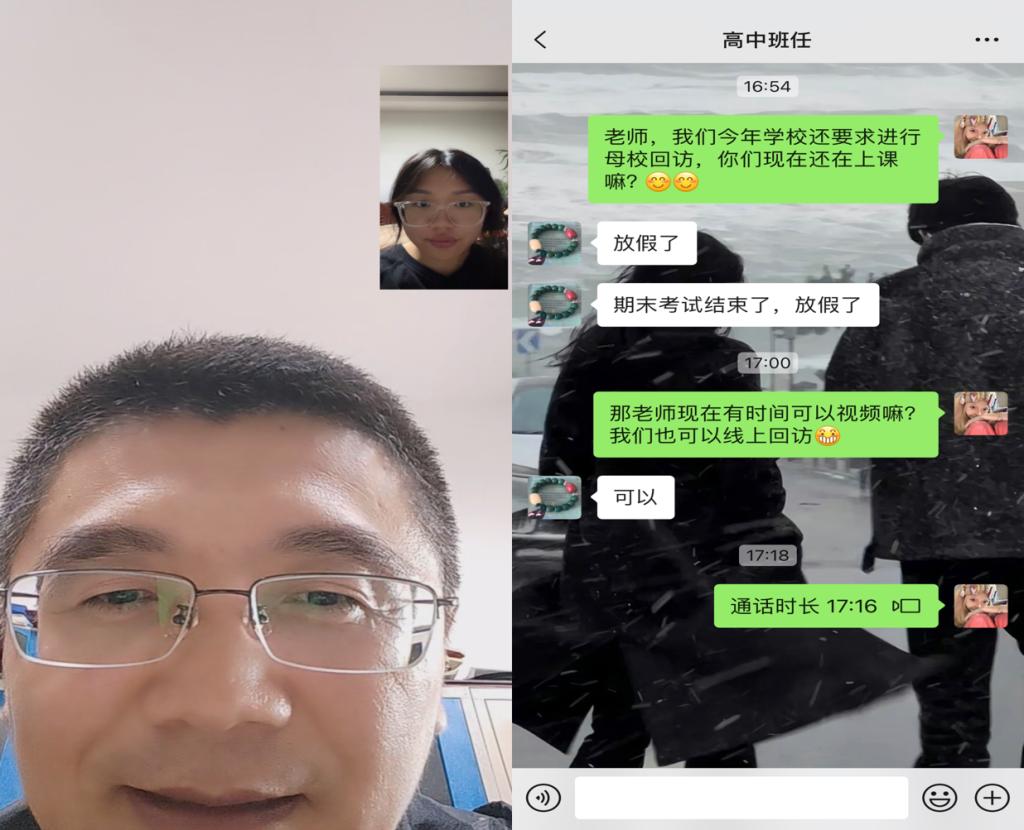 由于学校已经放假,所以我选择线上视频电话的形式与老师取得联系,在聊天的过程中,我和老师讲述了我这一年半的大学生活,和我平时的一些表现;老师对此很满意;老师也和我讲了讲他新带的这个班级的一些小故事,一些调皮捣蛋的孩子,听着老师的讲述,我想起自己的高中生涯,满满的回忆。在视频聊天最后,老师希望我好好学习理论专业知识,将来找一份好的工作。聊天结束后老师把我的联系方式发到了他的班级群,部分学弟学妹加了微信后向我了解大学的生活,我也以自身为例,提出了我的一些建议和学习的经验,帮助他们更好的完成自己的学业。