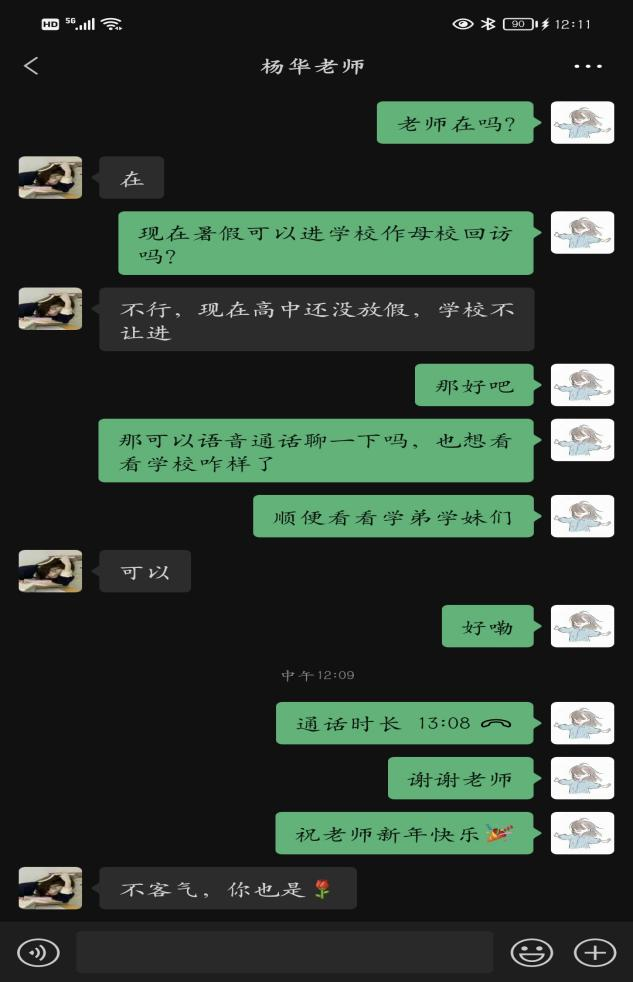 而我在母校回访中拜访了我的高中齐市第二十四中学,并与我的高中班主任杨华老师进行微信交谈,也和她聊了我的近况和学习,老师对我说高中的学习与大学的不同,大学要多多注意文化课的学习和专业实践相结合才能发挥出最大的功效,这对我来说也是一次有收获有意义的活动。