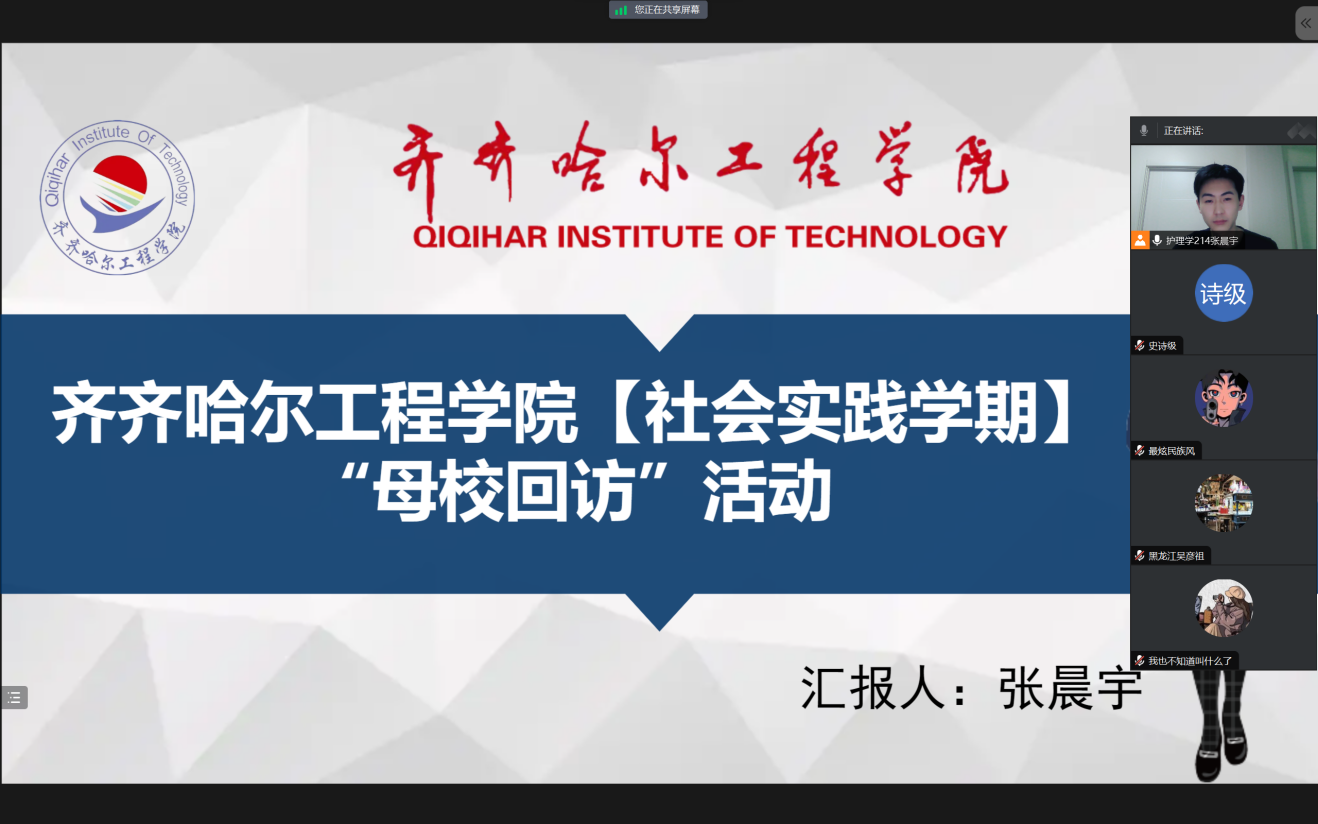 第一周我们响应学校号召,积极参与准备了社会实践学期回访母校活动,由于距离和学校放假原因我们跟学校老师商议采取线上方式进行回访老师表示热烈欢迎即肯定。