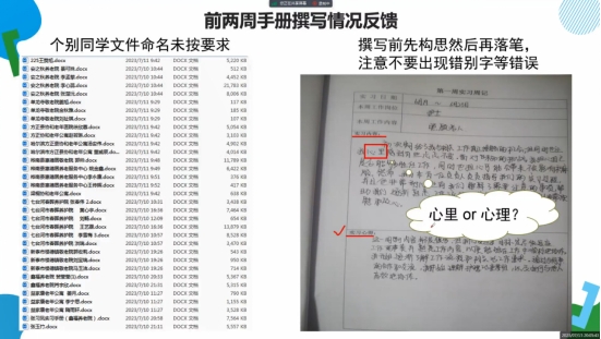 首先,张道勇老师反馈学生实践手册的撰写问题,明确手册中实习内容和实习心得的撰写要求。同时利用学生上交的照片为案例带领学生进行分析。通过分析学生更加明确自身在文字撰写方面还需努力积累和学习。
