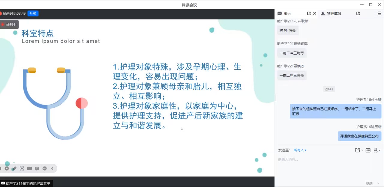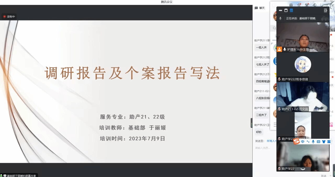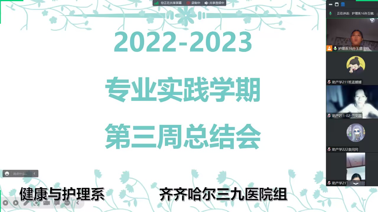 为全程掌握学生专业实践学期学习质量,保证学生专业实践质量与实践安全。2023年7月9日晚,健康与护理系助产学专业齐齐哈尔三九医院组于腾讯会议组织召开“专业实践学期第三周总结会议”。本次会议由助产学专业教师孙玉翡、基础部教师于丽媛主持,30名学生共同参加。