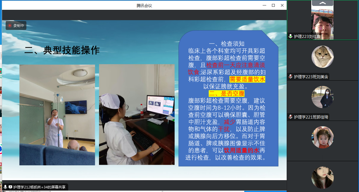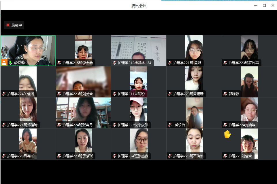 7月9号下午5点,马静老师利用腾讯会议召开了第三周专业实践总结会议,会议上老师首先强调了第三周的检查情况,分别从着装、妆容、护士礼仪、适应度、作业检查情况进行总结。之后各个实习医院的小组人员汇报ppt,通过汇报教师了解到各位同学的真实实习情况以及各位同学在实习中遇到的困惑,包括参与到各种真实的护理场景中、与医护人员如何密切合作等。同时,老师也检查了本周作业完成情况及质量,并细致指导个案、调研报告如何进行书写等。