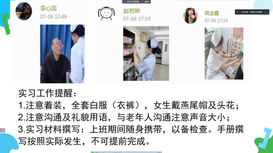 其次,张道勇老师从着装、沟通及材料等方面向学生作出提醒。并提醒各位学生要明确身份,做符合护士身份的事情,让实习单位和患者看到我们的职业特质。同时提醒各位同学做事按部就班,不能提前或延后完成实习手册。