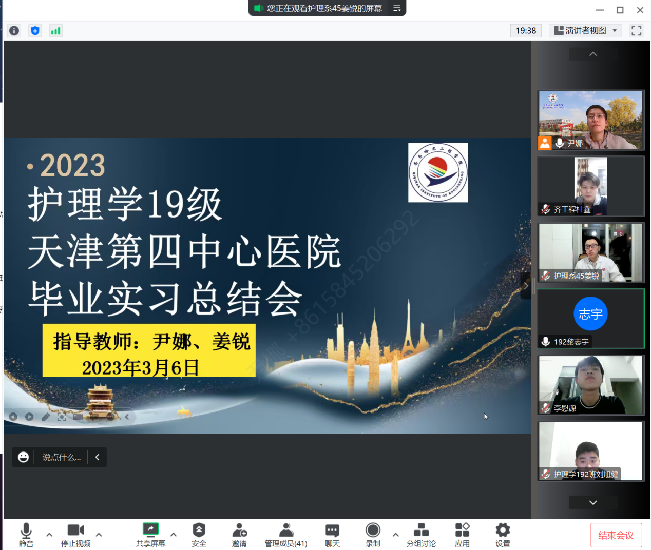 2023年3月6日,在腾讯会议召开护理学19级天津市第四中心医院毕业实习总结会,会议由姜锐老师主持,尹娜老师与47名同学共同参加。