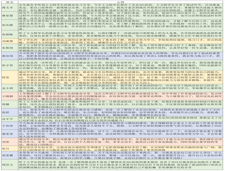 王玉财学长根据自己的经历,向同学们介绍他面试的过程及经验,首先介绍了近几年医院的招聘原则,并且建议同学们在面试中一定要突出“重点”,在面试中的技巧应该先把过硬的条件放在最前面,剩下的依次往后推,最重要的就是语言一定要有逻辑性做到简洁还有精华。同时还分享了同学们最关心的薪资待遇问题,在面试中也会问到问题但大多数都是针对专业实践方面的,所以学长还是建议同学们应该熟练自己的专业实践。通过本次分享,使我们了解到了解放军总医院第一医学中心(301医院)的面试,相信这对19级正在应聘的同学们很有帮助,目前应聘解放军总医院第一医学中心(301医院)的同学们也积极向王玉财学长提问,王玉财学长耐心的解答同学们的各种疑问,最后于晶老师和同学们十分感谢此次王玉财学长的分享。
