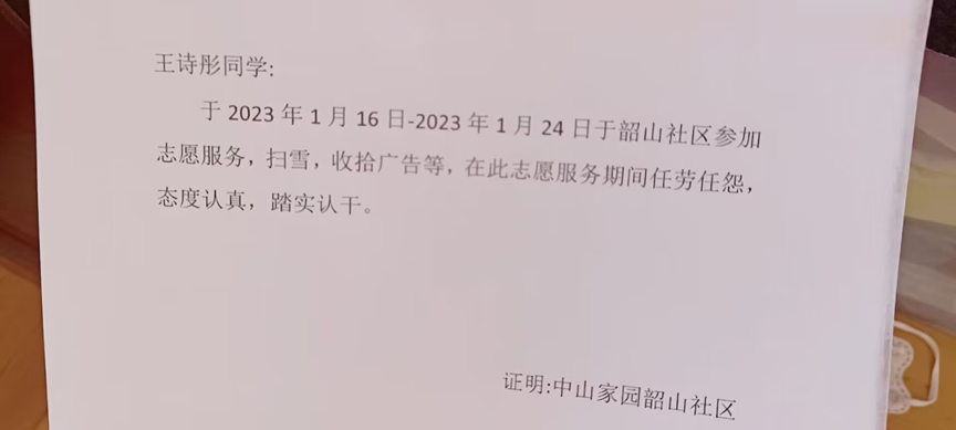 王诗彤同学在这个假期完成了一本字帖,米字格,母校回访,志愿服务两次,读书分享,健康运动劳动这个假期我收获了很多,帮助社区的人们扫雪,清理广告等,有很大的成就感