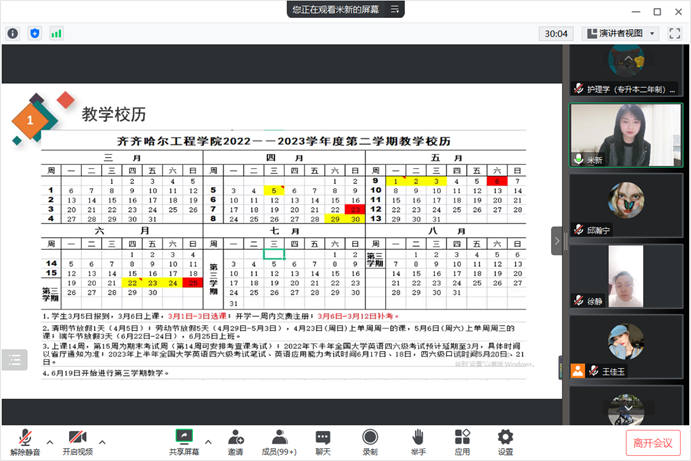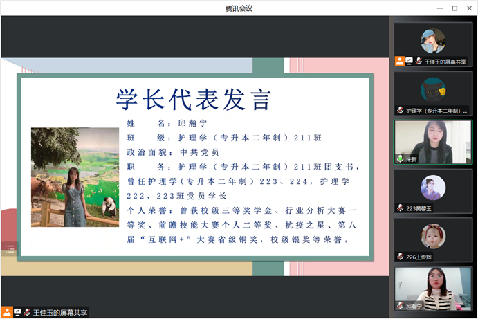 2023年2月28日,健康与护理系2022级护理学专升本专业家长会于18点整以线上形式在腾讯会议组织开展,此次家长会由护理学(专升本二年制)223班王佳玉同学主持,参与本次活动的人员有健康与护理系护理学专升本专业长单大海老师、学生辅导员米新老师、护理学专升本党员学姐邱瀚宁同学以及全体家长和同学。