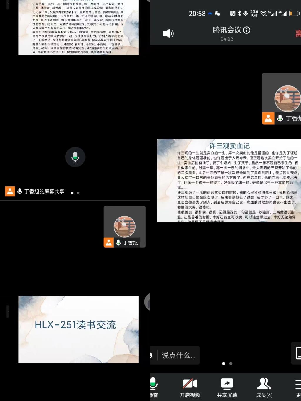 我们组四个人都在规定的时间内完成了阅读,读书分享与心得。阅读的书籍是各自在网上看的电子版,然后我们组的读书分享是通过制作PPT在腾讯会议上展示,与其他小组成员分享自己阅读的书籍和书中有趣或者难忘的一两件事例,最后再说说这本书给我们的启发和感想。