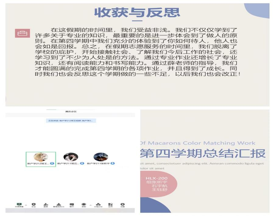 在第四学期期间我们收获良多,提升了书写阅读能力,从志愿服务中领悟助人为乐的魅力,也从专业实践中增长专业知识,提高“三五能力”。感谢指导老师教导,让我们成长很多。同时我们会总结反思不足并且会加以改正。