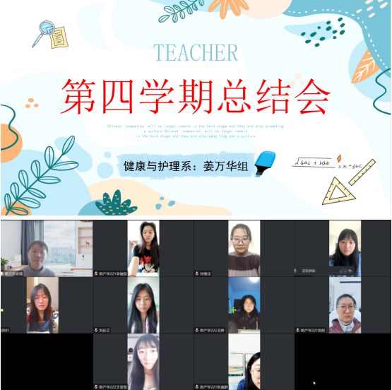 2023年2月26日星期日下午,健康与护理系生涯导师姜万华通过腾讯会议指导三个小组联合召开了第四学期总结会,本次会议由指导教师和10名同学参加。
