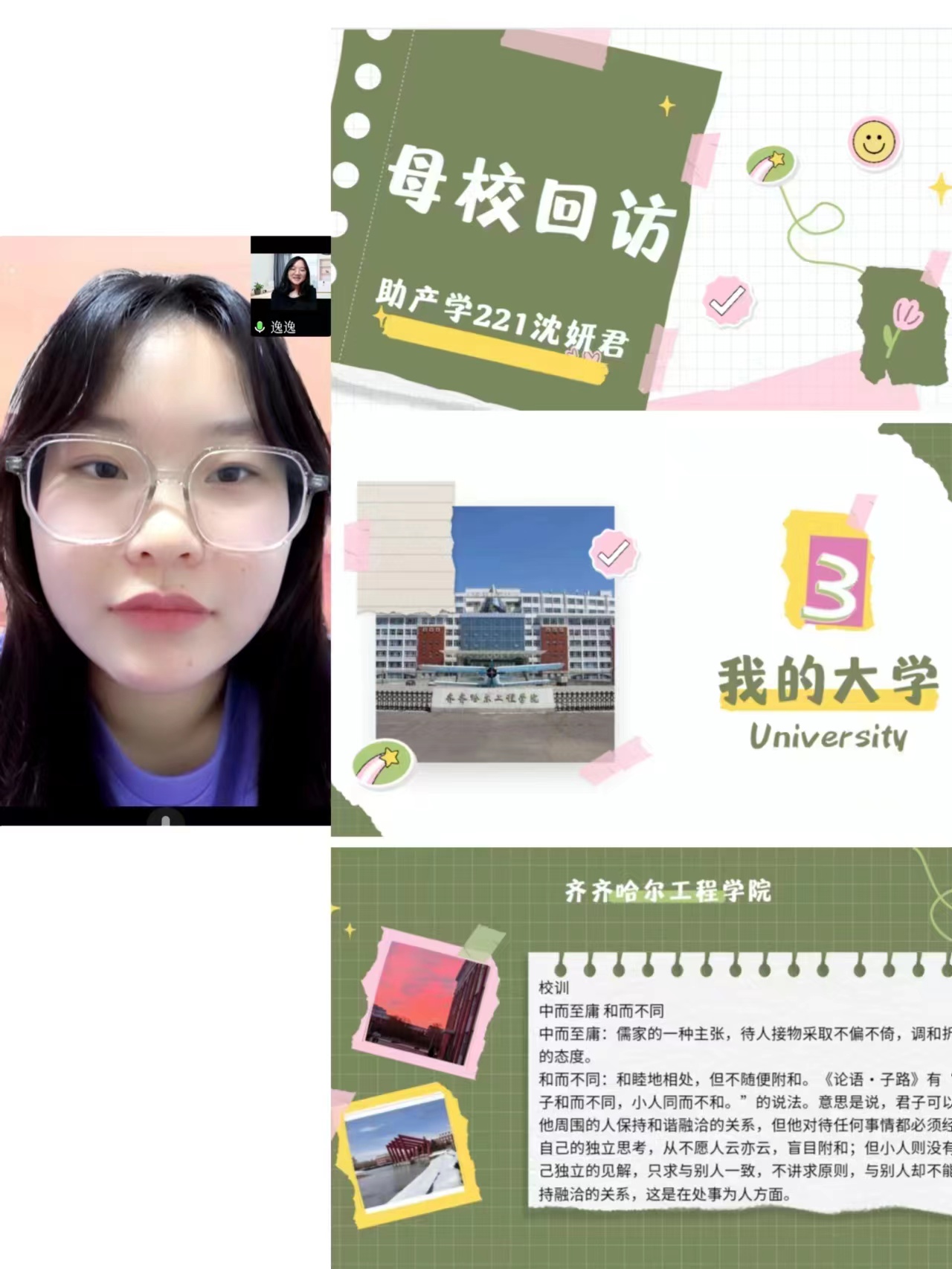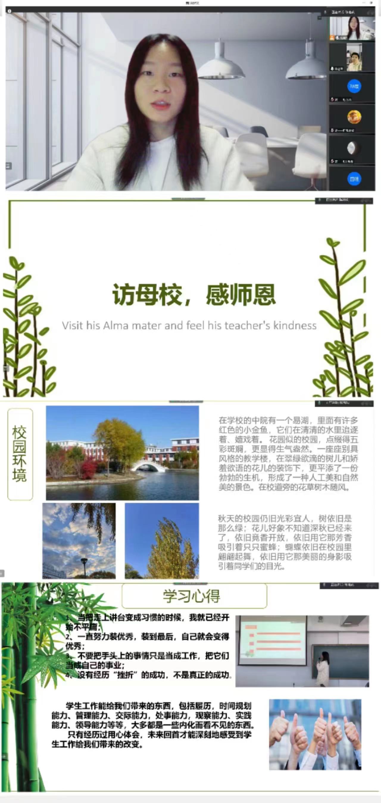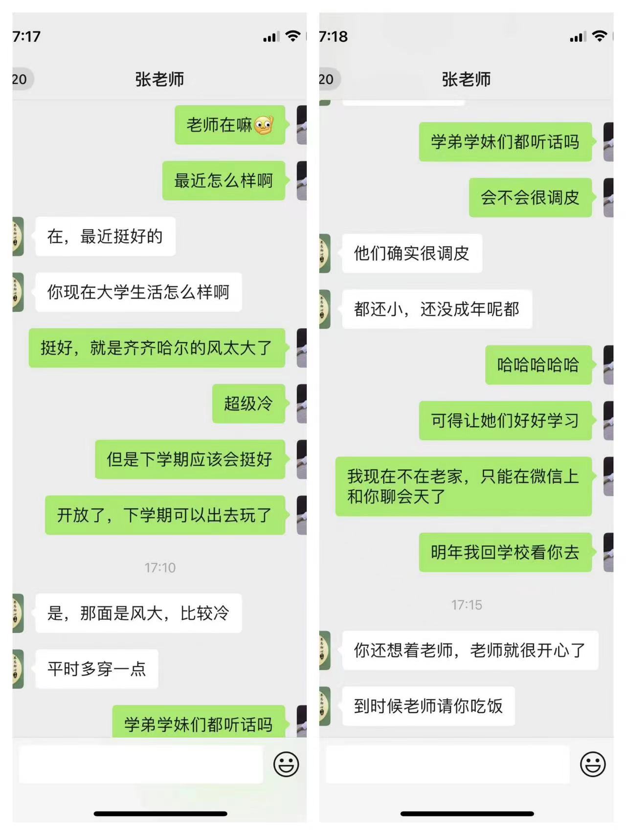 活动内容包括必修项目和选修项目,母校回访就是必修项目之一。由于我现在在外地,无法回到母校看望我的高中老师们,所以采取了微信线上聊天的形式和高中时候的班主任张永芳老师进行了这次活动,庆安县第三中学是我们那里比较不错的一所高中。也是让我感到骄傲的母校!虽然我的班主任许久没有联系,但是她仍然很是关心我,关心我的日常生活,就像在高中的时候一样,高中的时候每次当生活和学习上遇到不开心和不顺利的事情的时候我都会在班主任的办公室里和他聊天,他就会很开导我,她既是我的班主任也是我的一位好朋友,真的很怀念高中时期的时光。