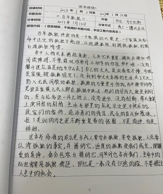 在本次的劳动践行中,方静同学在帮助父母做家务的同时感受到了劳动的快乐,她分享道:家务劳动能提高生活的幸福感,在一个干净舒适的环境下生活可以让人的身心得到放松,也会增加愉悦感,每次家务后,都会觉得身心舒畅,劳动也是一件很美妙的事。提到母校回访活动柳思源同学谈到:不管是友谊还是师恩,这些都是母校给的。感恩母校给了我们一个优良的学习环境,让我们迈向光辉的未来。母校对我们的教育,我一生都难以忘怀。胡佳慧同学阅读了西亚·马尔克斯的《百年孤独》。在后续的组内读书分享中她提到:当代人要学会孤独,享受孤独。人总要认清孤独的事实,并接纳它。适度的孤独使我们成长。理解爱的真谛,体会包容与接纳它,同时也告诉我们,生命中的灿烂需要用孤独偿还、回忆是一条没有归途的路,不要错过人生中的机会。