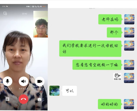 回访过程中,黄世钰同学首先对老师的身体情况进行了问候,随后就离校后学校的变化展开了讨论。老师在回访中感叹,因为疫情影响,这一届的学生由于大部分时间都为线上形式听课,除个别学生外其他学生整体学习成绩有了较大的下滑,疫情对学生的影响巨大。
