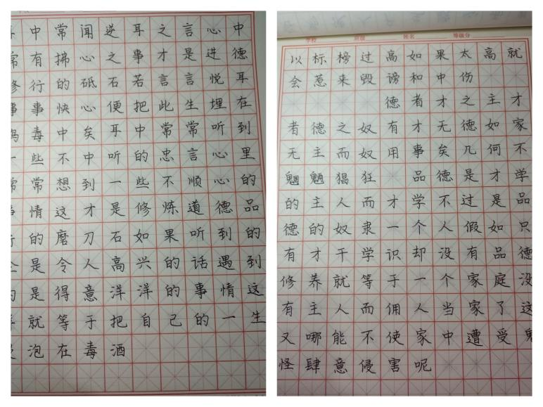 学校组织的“第四学期”即将要画上圆满的句号了,为了促进学校提倡的“三五能力”中的汉字书写能力,学校在“第四学期”安排了字帖临摹活动,通过字帖临摹我的汉字书写能力有一定的加强,字体变得更加美观整齐。