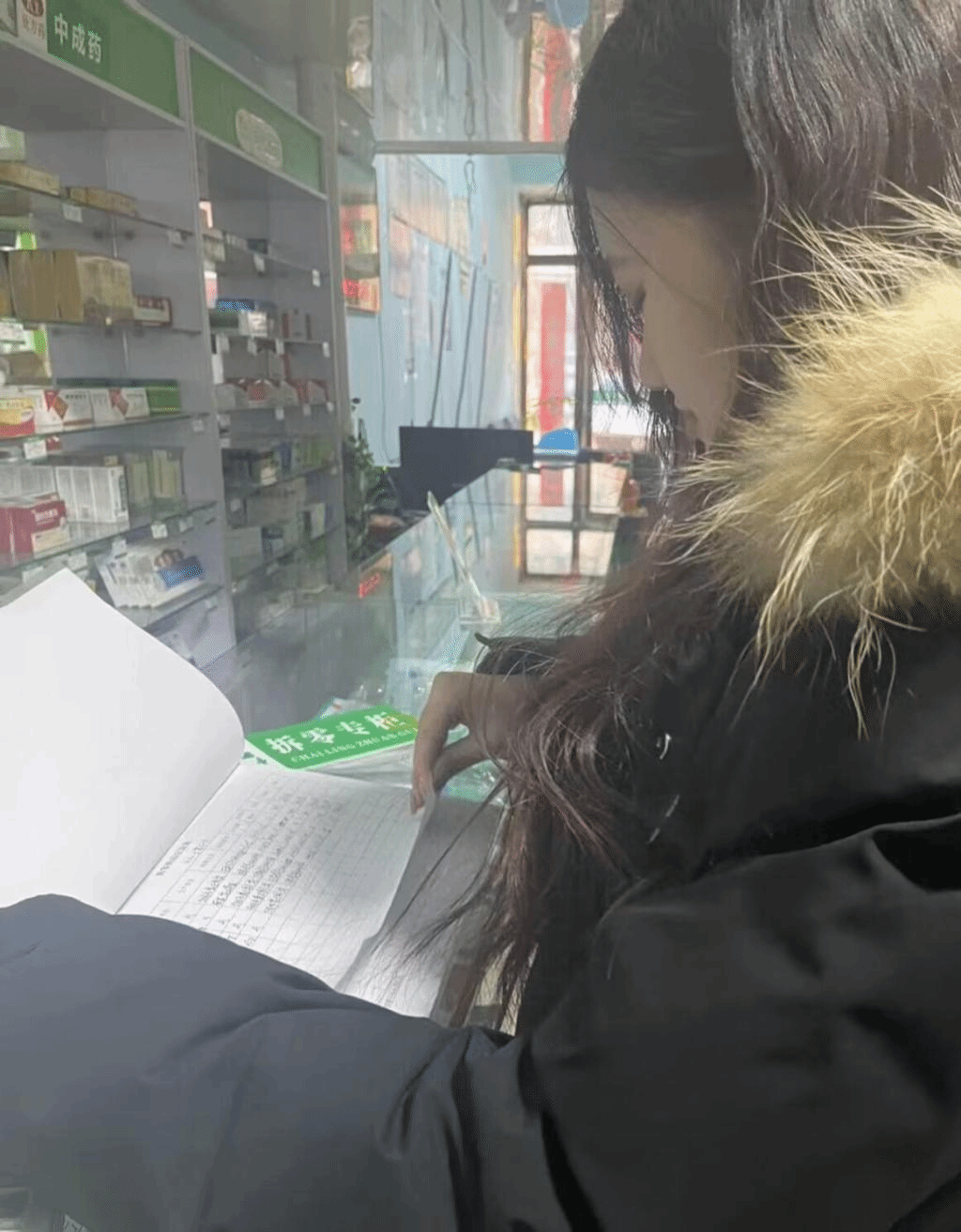 组员李本源在社区药店帮忙统计调查居民的用药种类和数量,以帮助社区药店对药品种类和数量的调整。在服务的过程当中李本源同学也非常的积极和耐心的,展现了当代新青年吃苦耐劳,勇于奉献的精神。