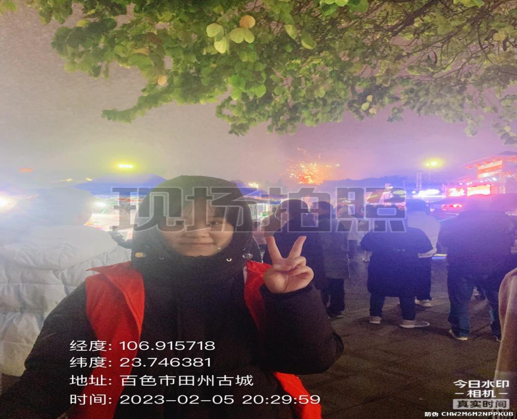 组员覃珍璇参加了元宵节的志愿服务活动,主要工作就是维持元宵节活动现场的秩序,防止发生混乱及危险事件的发生。在维持秩序的过程当中她也总是向有困难的人伸出援手,向迷路的人解答疑惑,给新来的旅客介绍本次的活动,在冷冷寒冬之中有了满满的人情和温暖。