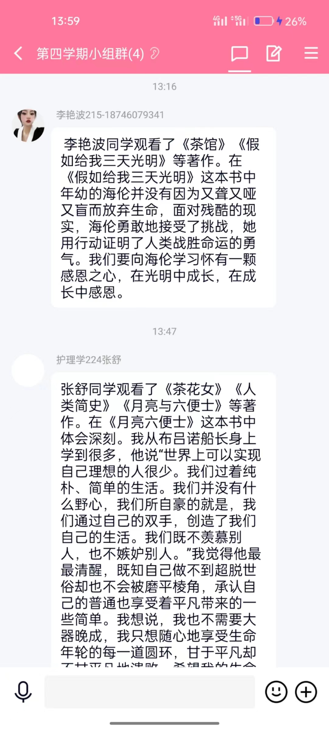 李艳波同学观看了《茶馆》《假如给我三天光明》等著作。在《假如给我三天光明》这本书中年幼的海伦并没有因为又聋又哑又盲而放弃生命,面对残酷的现实,海伦勇敢地接受了挑战,她用行动证明了人类战胜命运的勇气。我们要向海伦学习怀有一颗感恩之心,在光明中成长,在成长中感恩。