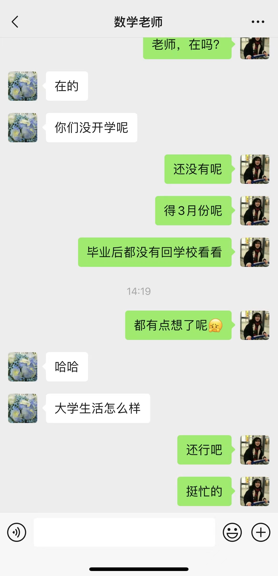 庞佳鑫协同自己班级同学通过会议的形式感谢老师三年来对自己的照顾,老师也表示看到现在的他们也感到很骄傲;曹永娜通过微信与老师进行交谈,这次期间老师提出了许多的建议,在大学期间也要认真学习,多读有益于自己的书,扩展交际圈提升自己;陈羽提前联系老师并且回到自己的母校天柱县第二中学,给学弟学妹介绍自己的大学和专业,讲述自己在大学中发生的事情。