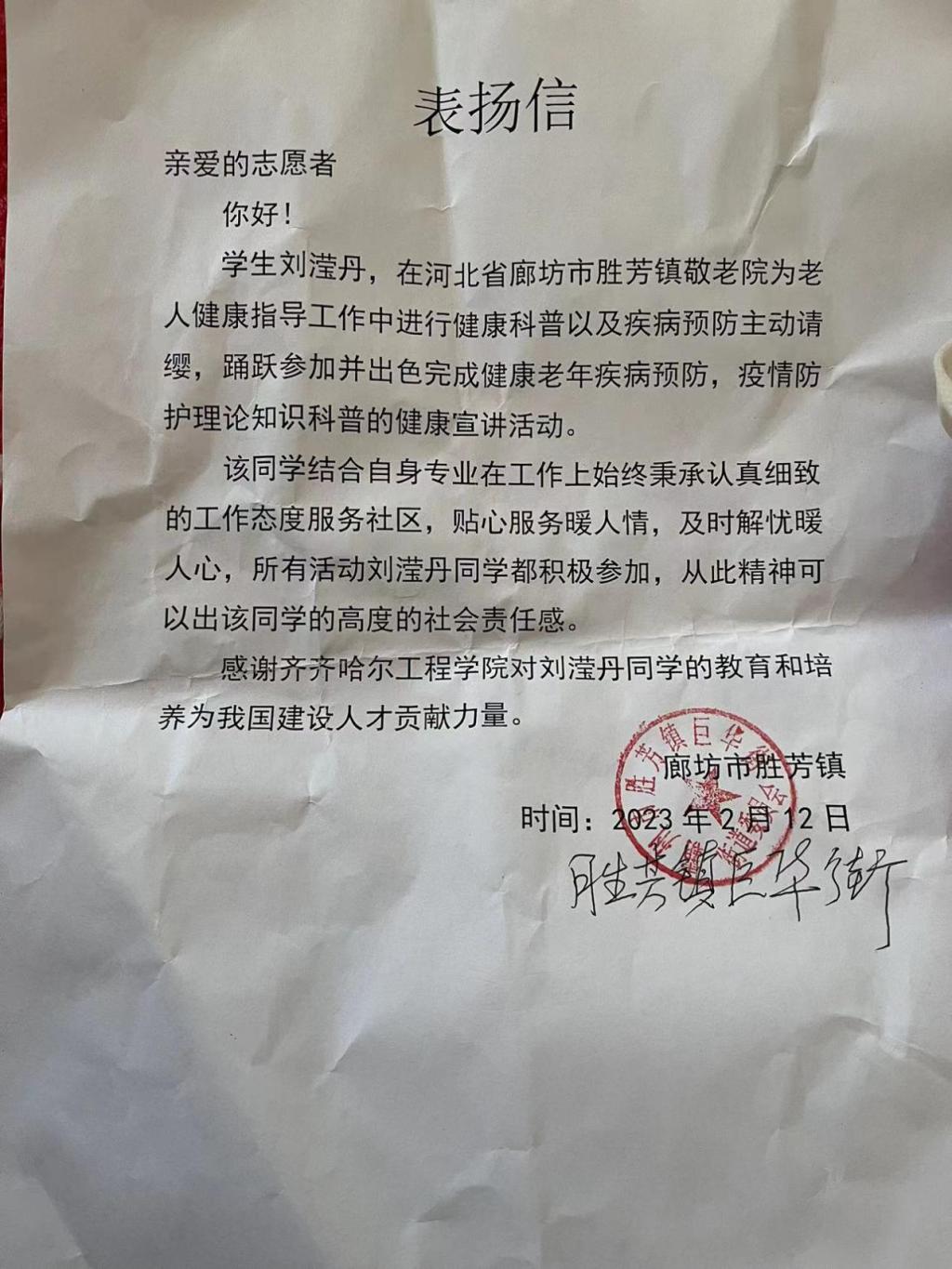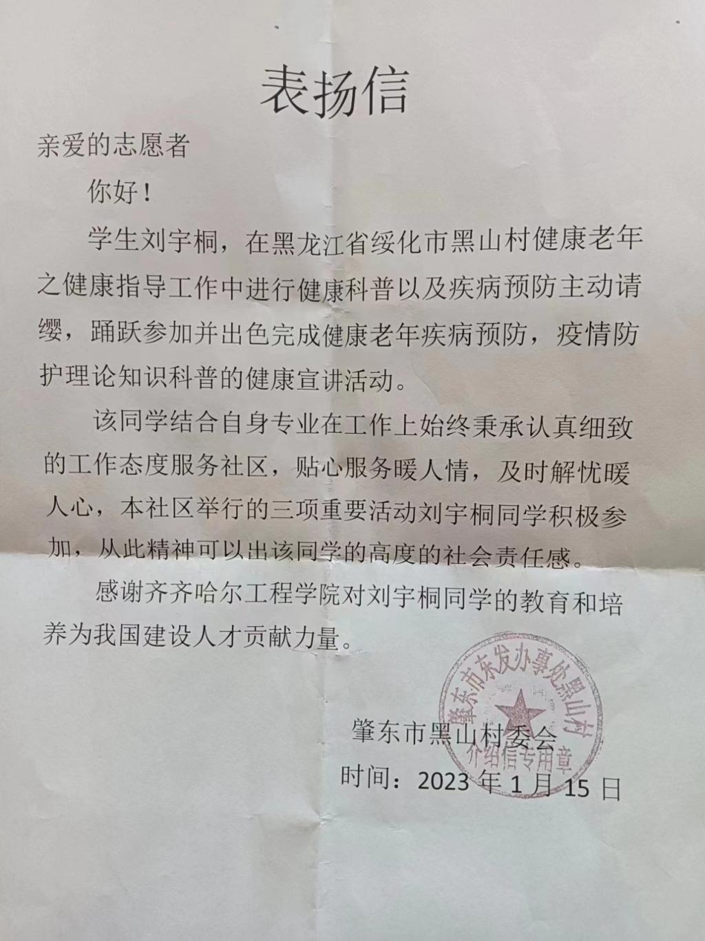 首先,健管221班吴雪彤同学于2023年1月15日获得社区表彰,该同学在社区的健康生活医疗活动中积极主动利用在大学所学知识参加健康科普以及对疾病的预防,结合认真细致的工作态度服务村民,积极帮助村民排忧解难:其次,健管221班刘宇桐同学于2023年1月15日获得社区表彰,该同学积极参与志愿者活动,踊跃参加并生动完成健康老年疾病预防,用自己的资源以图字并茂的形式为老年人普及健康的重要性以及预防疾病的方法,该同学贴心服务暖人情、及时解忧暖人心;最后,健管221班刘滢丹同学在社区中积极主动的参加健康老年疾病防御,并为大家讲解疫情防控相关知识的普及。